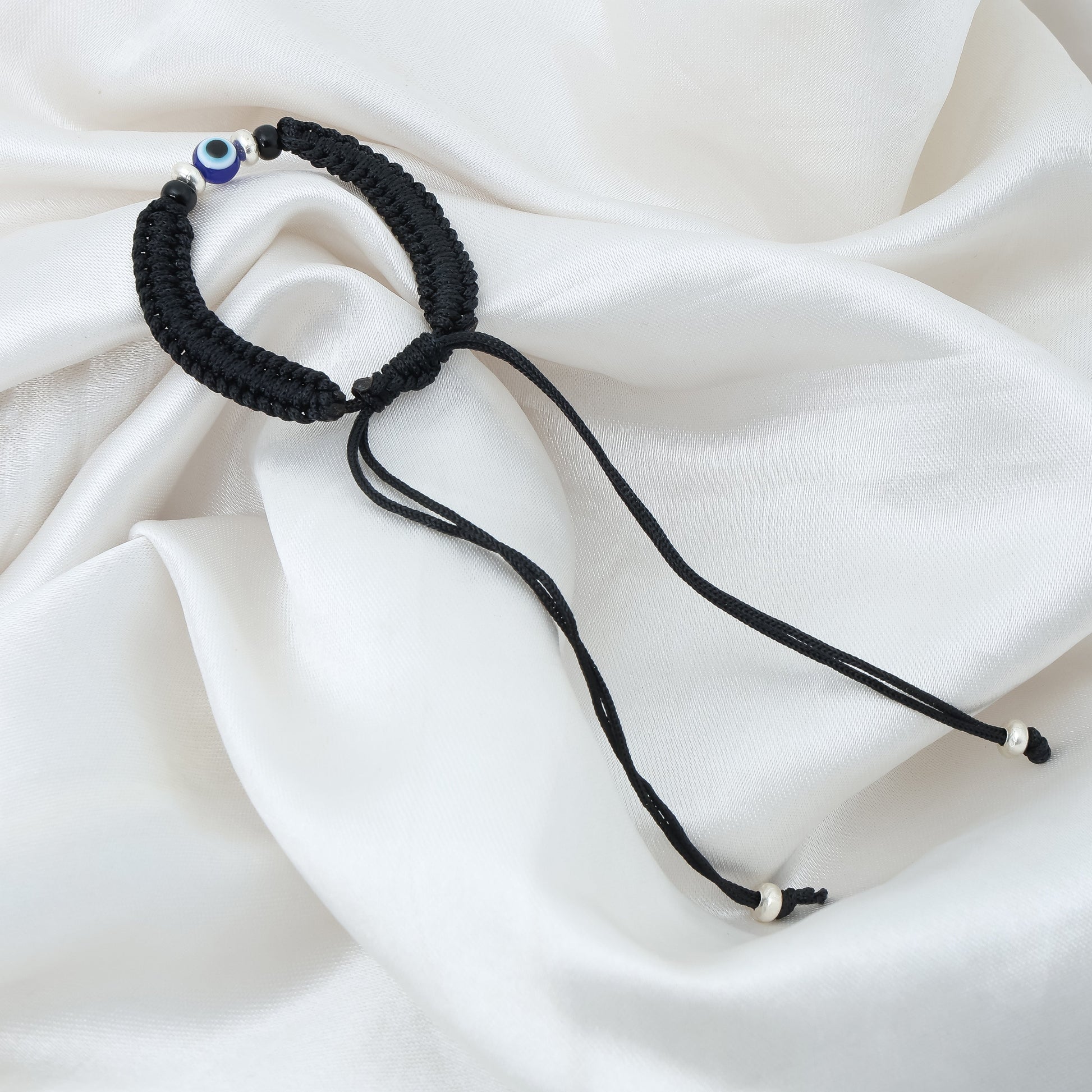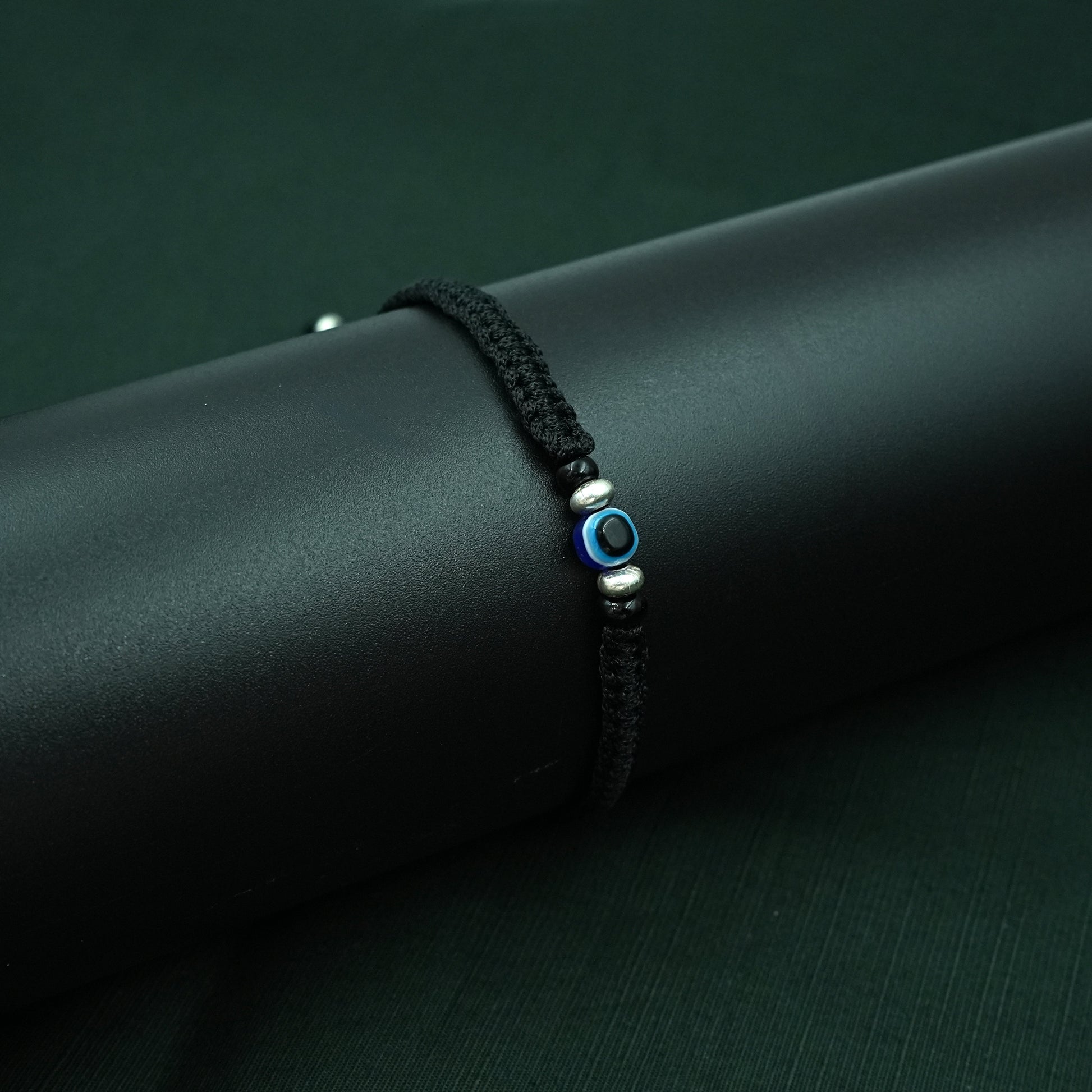 This Silver Evil Eyes Adjustable Dhaga Bracelet combines traditional charm with contemporary design. Crafted with sterling silver, it features multiple evil eye charms known for their protective qualities, believed to ward off negative energy. The adjustable dhaga-style cord ensures a comfortable fit for all wrist sizes, making it a versatile accessory for everyday wear or spiritual significance. Expertly designed, this bracelet offers both style and symbolism in one refined piece.